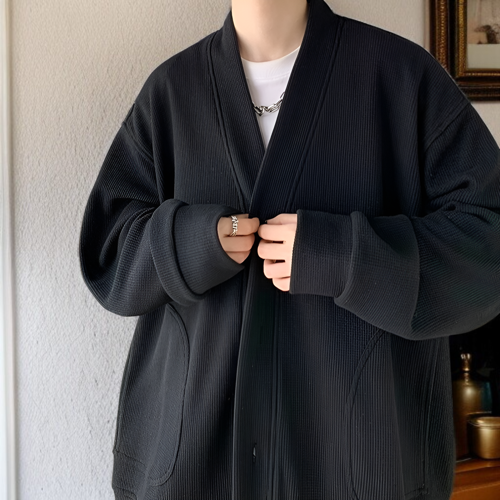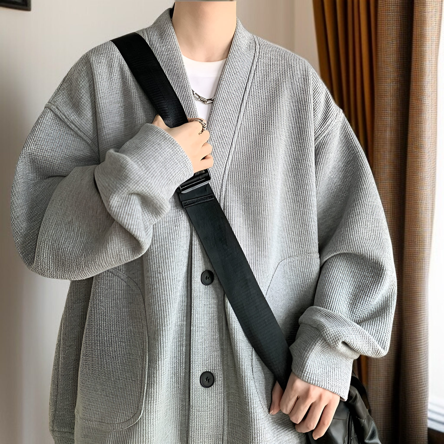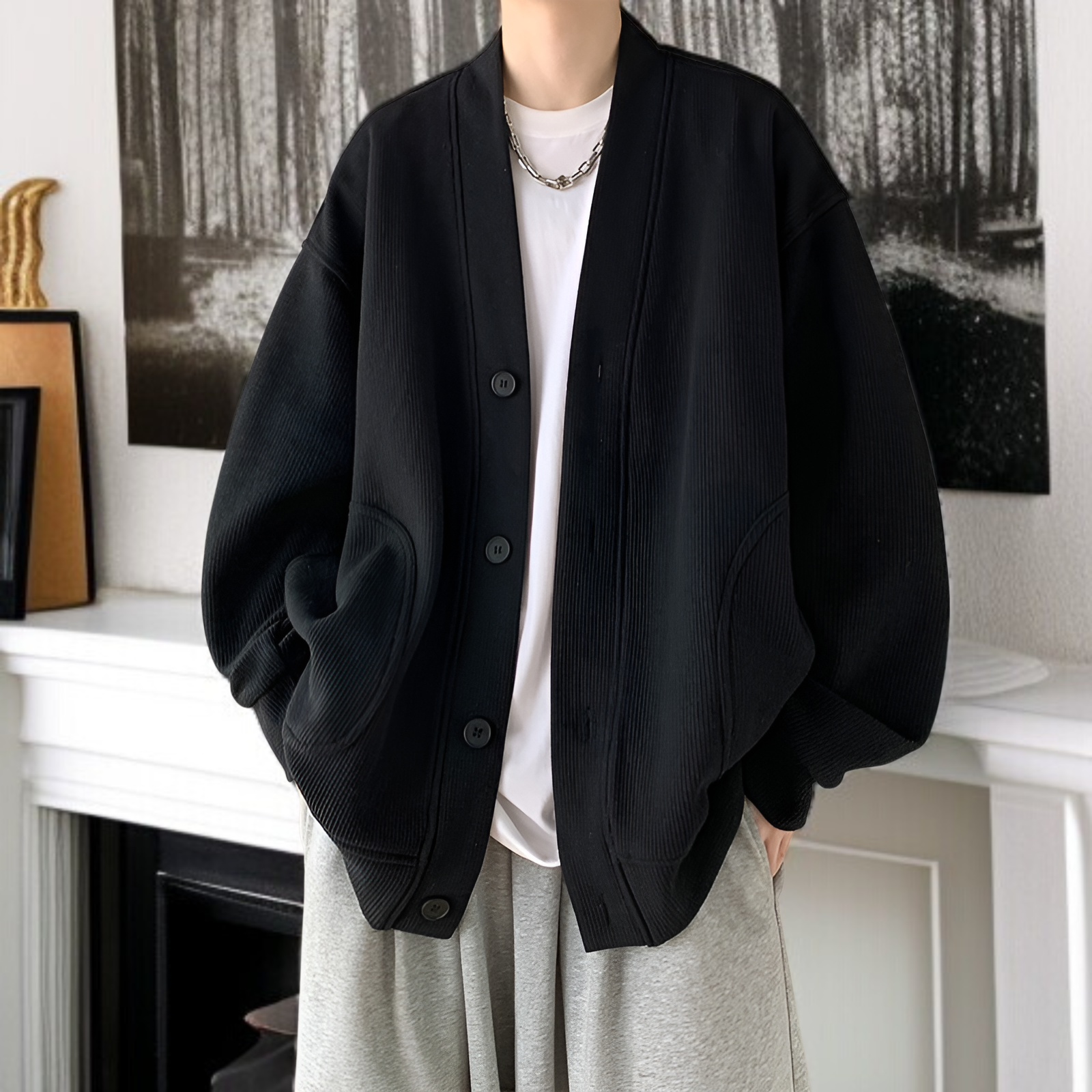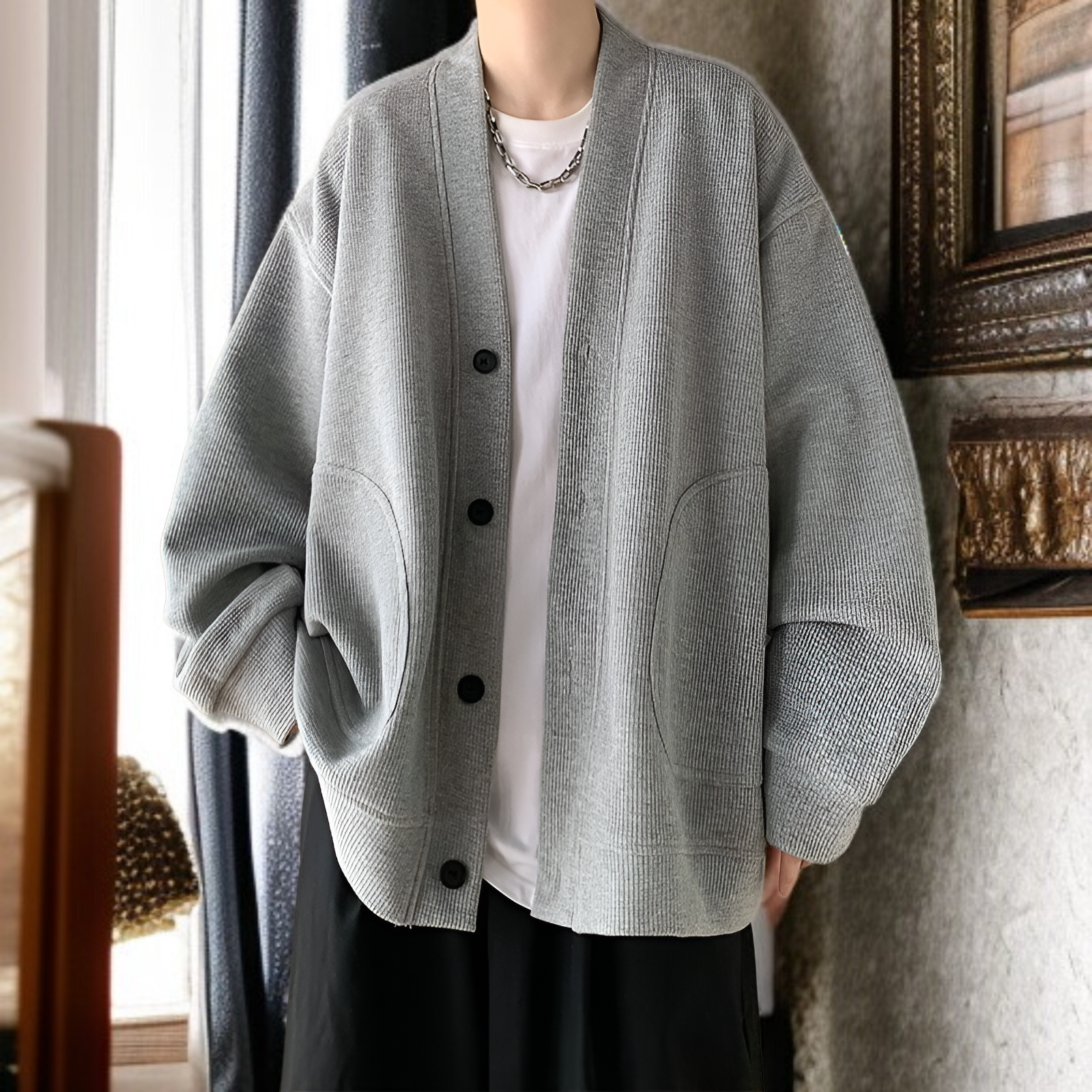 春と秋に着用する男性用のレイジースタイルのウールカーディガンジャケット、Vネックのアメリカンジャケットを備えた先進的な若々しいフードなしセーター